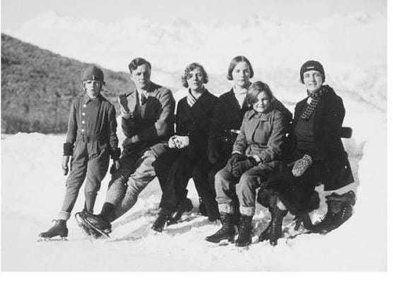 That same year Tom holidayed with his parents and assorted sisters at St Moritz, where they skated constantly. This was a family obsession. As a girl Sydney Redesdale had loved skating, and had a passion for her instructor: ‘I would even let him kiss me,’ she wrote in her diary. Her husband David, still with that excess of energy in his early fifties, often visited the skating rink in Oxford with his brother Jack, where both men flirted gallantly with the Austrian instructresses. Unity won a medal for skating (although on one occasion she fell on her face, having failed to put out her hands in time: ‘I was waiting to see if nature would prompt me’). Tom was talented enough to partner the Olympic champion Sonja Henie (who skated through several Hollywood films), while Deborah was actually invited to join the British junior team, although her mother turned this down without telling her of the offer.